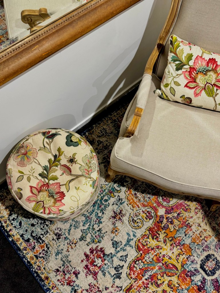 Mum had the lampshade and cushions custom-made with ‘Malmsbury Willow’ fabric from Warwick Fabrics. Pink and neutrals quickly became the colour theme for this corner, which we continued with further design choices, including the rug from Temple & Webster.